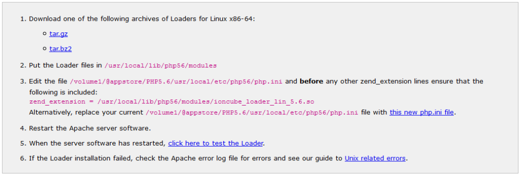 In den meisten Fällen wird die Zend-Extension noch nicht auf dem Synology System vorhanden sein. ionCube gibt uns unterhalb der Fehlermeldung bereits Installations-Instructions vor, allerdings muss man auf der DS mit einem kleinen Workaround arbeiten, da wir nicht per root mit einem FTP-Programm zugreifen können.