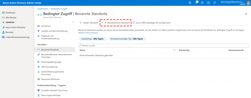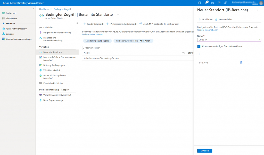 Dazu wechseln wir erneut in das Azure AD Portal unter „Azure Active Directory“ -> „Sicherheit“ -> „Bedingter Zugriff“ -> „Benannte Standorte„. Hier können wir mit dem Menüpunkt „IP-Adressebereiche“ einen neuen IP-Scope hinzufügen.